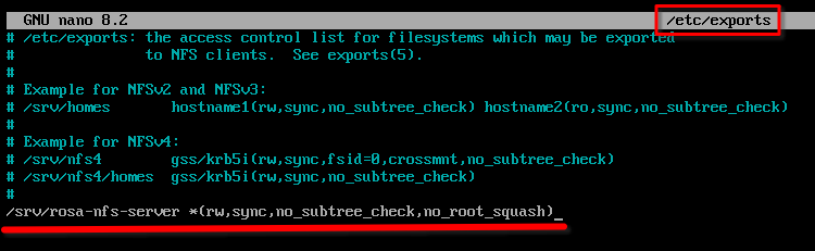 Пропишем нашу директорию в данный файл, добавив в конец файла строчку: /srv/rosa-nfs-server *(rw,sync,no_subtree_check,no_root_squash)