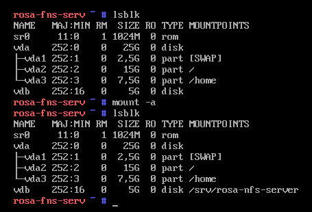 6. Теперь создадим директорию, куда будет монтироваться наше сетевое адресное пространство и публиковаться в сети. В нашем случае это директория /srv. Используем команду mkdir /srv/rosa-nfs-server