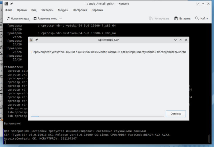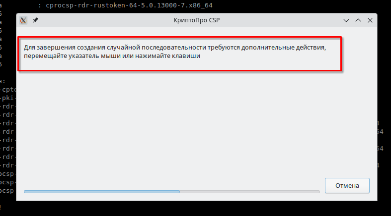 После предлагается сформировать ключ в процессе хаотичного движения курсором мыши по области окна КриптоПро SCP (подсказка в окне имеется по этому поводу, а также полоса прогресса процесса).